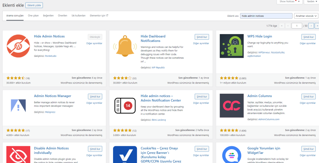 Hide Admin Notices eklentisini kurup etkinleştirmek yeterli.